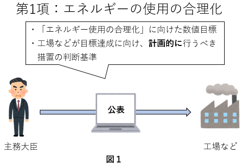 1) 第1項では主務大臣が、第2項では経済産業大臣が、工場等においてエネルギーを使用して事業を行う者の判断の基準を定め、公表することを規定している。