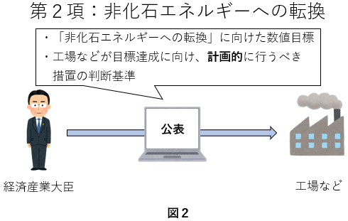 第2項:工場等における非化石エネルギーへの転換の適切かつ有効な実施を図るため、この項に掲げる事項並びに非化石エネルギーへの転換の目標及び当該目標を達成するために\( \ \boxed { 1\strut } \ \)に取り組むべき措置に関する判断の基準