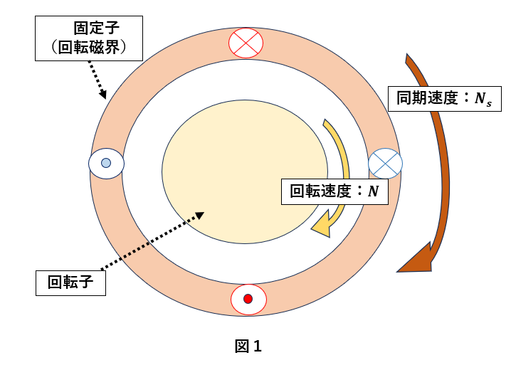 誘導機は主に固定子で発生する回転磁界と、軸でつなぐことで物を回転させる回転子から成り立っています。固定子に張り巡らされている巻線に電流を流すことで回転磁界が発生し、磁界の回転に誘導されて回転子も回転します。